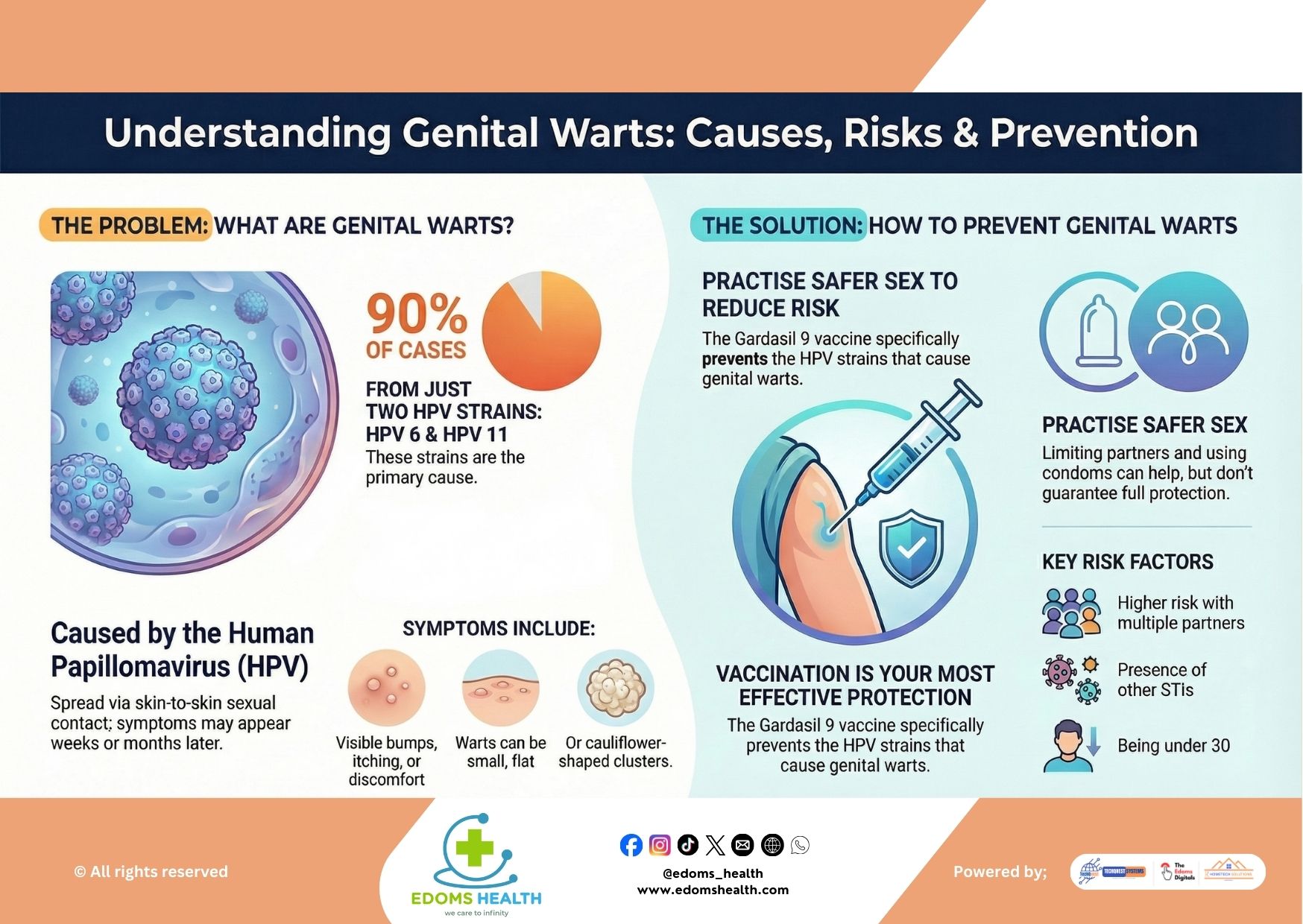 Key Fact: 90% of genital wart cases are caused by just two low-risk HPV strains: HPV 6 and HPV 11. Unlike high-risk HPV strains that can lead to cervical, anal, or oral cancers, these strains primarily cause warts and do not typically lead to cancer.